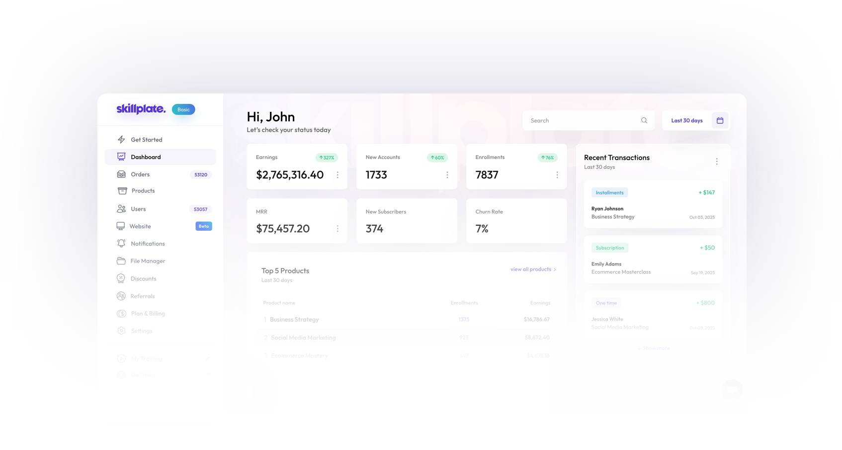 Focus on content creation and get everything you need to sell instantly without spending time on the platform and without any fees. With Skillplate you get a branded website, landing pages, checkout & customer portal automatically & instantly.